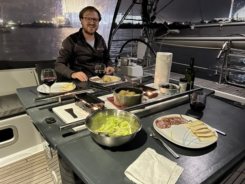 We leave the dock in the evening and move to an anchorage and I was treated to the typical french raclette meal of melted cheese over potatoes! Liz and Henri are the best!!!
