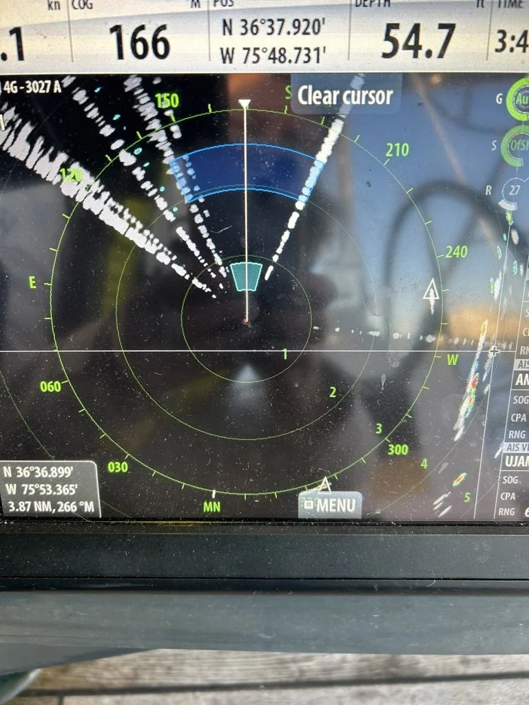 For the most part it is a non-event. During the day there are several false positive radar alarms due to the reflection from the waves (I’m assuming). I stay in the cockpit all night sleeping until an alarm wakes me. It takes about 24 hours to get out to the tip of Cape Hatteras. I’ve been able to sail/ motor sail most of the way there. I round the cape during the day, but am very exhausted. I want to sleep but there are so many fishing vessels, it’s like dodging lobster pots around Boston! Finally towards the afternoon there are not many vessels, and I get to sleep for and hour or two at a time.