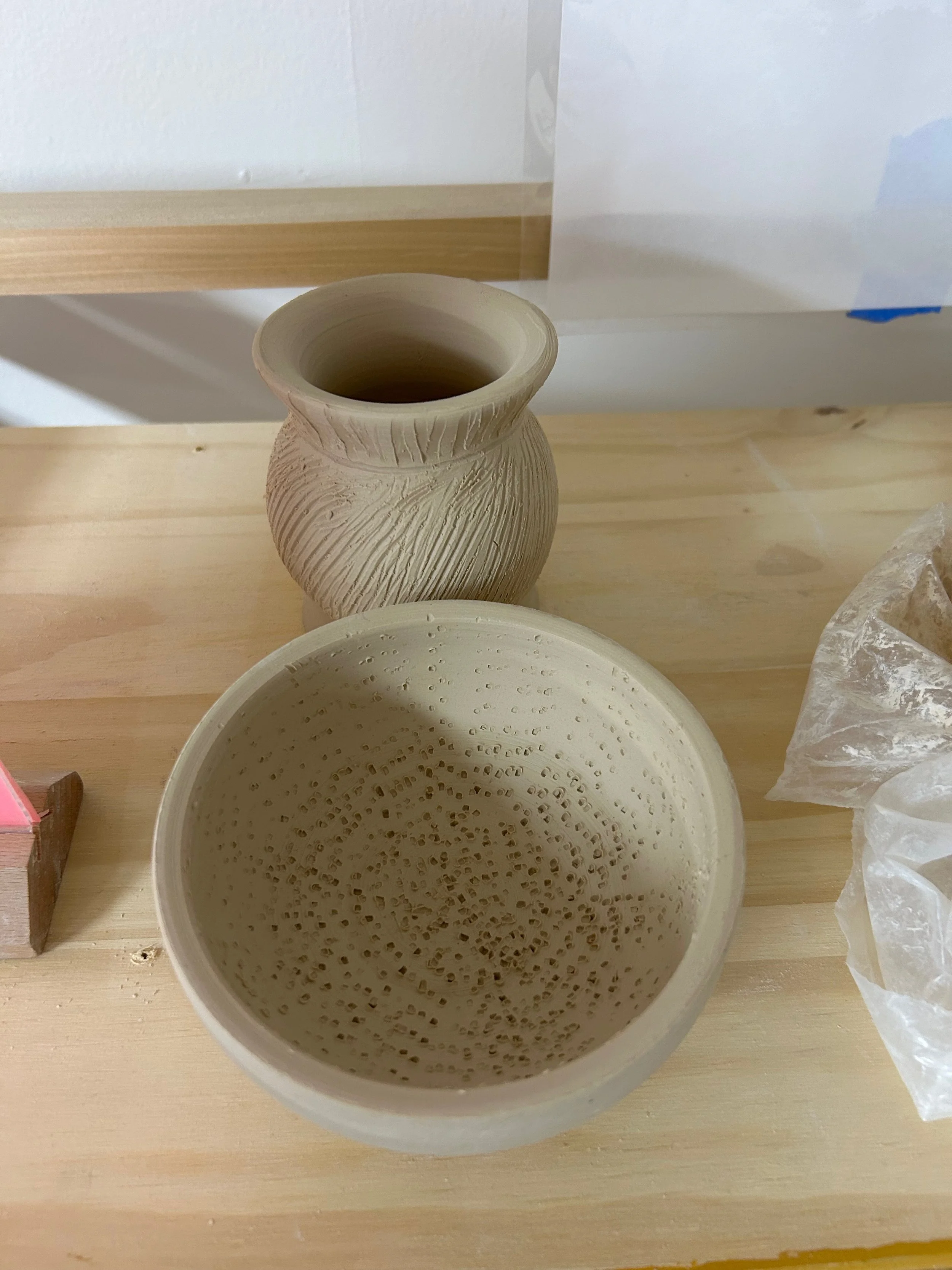 Now that I’m back in Boston, I’ve rejoined the Pottery Mill and these are the first 2 pieces that are ready to be bisqued fired. I initially threw the 4 pieces below, but 2 of them ended up being trashed during the trimming phase).